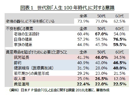 「人生100年時代」到来以前から、老後資金の取崩し方法については様々な研究がある。日本の平均寿命が男性で71歳、女性で76歳であった1974年において、既に絶対に生存中に資産が枯渇しない方法が提案されている。資産が生み出す利子や配当だけを消費に回し、元本には手を付けない方法(以下、「トービン法」)である1。配当利回りが2%の場合、「トービン法」を実践するには年間不足額の50倍(=100%÷2%)の資産が必要となる。しかし、そもそも年間不足額の50倍の資産を65歳時点で保有していれば、運用しなくても資産を取り崩していけば50年間分の資産があるので、115歳(=65歳+50歳)まで資産は枯渇しない。つまり、「トービン法」を実践できる人は、金銭的不安がさほど深刻でない人である。金銭的不安を抱える人にはあまり参考にならないとも言える。