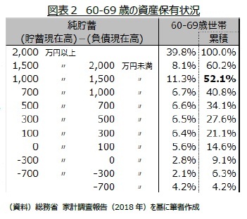 1994年には、生存中に資産が枯渇しない取崩し方法として「4%ルール」が提案されている2。「4%ルール」とは、退職時における保有資産の4%を毎年引き出す方法で、4%というレベルは過去の資産価格及びインフレ率データを用いて導かれた結果である。「4%ルール」を実践すると、少なくとも35年は資産が枯渇しないとされる。つまり、65歳退職なら100歳まで資産が枯渇しないので「人生100年時代」に適しているが、資産運用が欠かせない。「4%ルール」が想定する資産運用手法は、「資産の50%を株式に、残りの50%を中期国債に投じ、かつ投資割合の維持に努める」といった方法である。年間不足額が60万円の場合、「4%ルール」を実践するには、退職時点で1,500万円の資産が必要(60万円÷4%)となる。「トービン法」よりは必要資産額が少ないが、60代のうち、1,500万円以上の資産を保有する世帯は50%に満たない。資産が1,500万円に満たない世帯は「4%ルール」の資産運用実践に加え、支出の抑制も必要となる。関連して、取崩し率(「4%ルール」における4%に相当)や資産の構成比を様々なパターンで評価し、より良いルールを模索する研究3や、生存確率も加味した研究4があるが、死亡時に少なくない剰余が発生するため「4%ルール」は非効率であることを指摘する研究5もある。