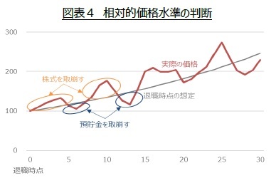実際は、相対的価格水準が高いのかそれとも低いのか、資産を取り崩す各時点においては分からない。そこで、毎年の取崩し額の決定に用いた株式の想定収益率通りに価格が上昇した場合の価格より、実際の価格が高い(低い)場合、株式(預貯金)を取崩すこととする(図表4参照)。「4%ルール」を実践するには、退職時における保有資産総額だけを把握すれば良いのに対し、「2つの財布法」を実践するには株式の想定収益率が必要である。「2つの財布法」は「4%ルール」と比べて、ハードルが高いと感じるかもしれない。しかし、株式の想定収益率の設定が困難ならば、過去データを参考に決定すれば良い。過去が将来にも当てはまるとは限らないが、「4%ルール」も過去のデータを用いて導かれたルールなので、実はたいした違いはないと思われる。