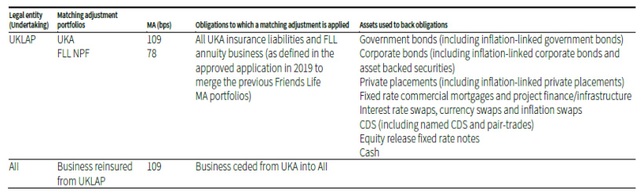 内部再保険者が(自らの留保リスクに関して)受け取ったMA利益は、グループの貸借対照表に保存される。AII MA利益の価値を反映するために、当グループの連結最良推定負債に対して調整が行われる。UKLAP MAの目的上、グループの連結最良推定負債を準備する際に、内部持分発行証券化は破綻しないと仮定されている。