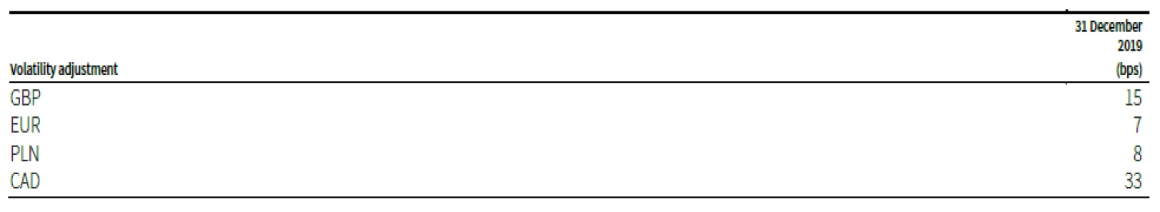 英国では、PRAは、UKLAP、Aviva Insurance Limited(AIL)(損害保険業務)及びAII(生命保険及び損害保険業務)に適用される申請を承認した。当グループの英国以外の重要な欧州経済地域(EEA)(フランス、アイルランド、イタリア、ポーランド)では、アイルランド政府の規制当局(アイルランド中央銀行)により承認されており、フランス及びイタリアでは承認申請の必要がない。該当する場合、VAは、MAが適用されない全ての負債に適用される。例外は、承認された申請に沿って、VAが適用されないUK Lifeにおけるユニットリンク契約である。各通貨のVAは、欧州委員会実施規則参照2019/228に記載されているとおり、以下の表に記載されている。トルコ、シンガポール、中国、香港及びインドでは、EIOPAによってVAが提供されておらず、VAが適用されていない。