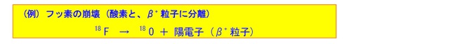 壊変により、陽子が1 つ減り、中性子が1 つ増えた原子核に変化する。原子番号は1つ減る。陽電子がβ+ 粒子となって飛び出る。