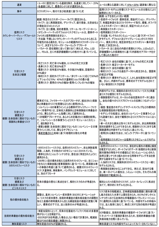 次の表は、リスクモジュール毎の標準式と内部モデルの違いの概要を示している。