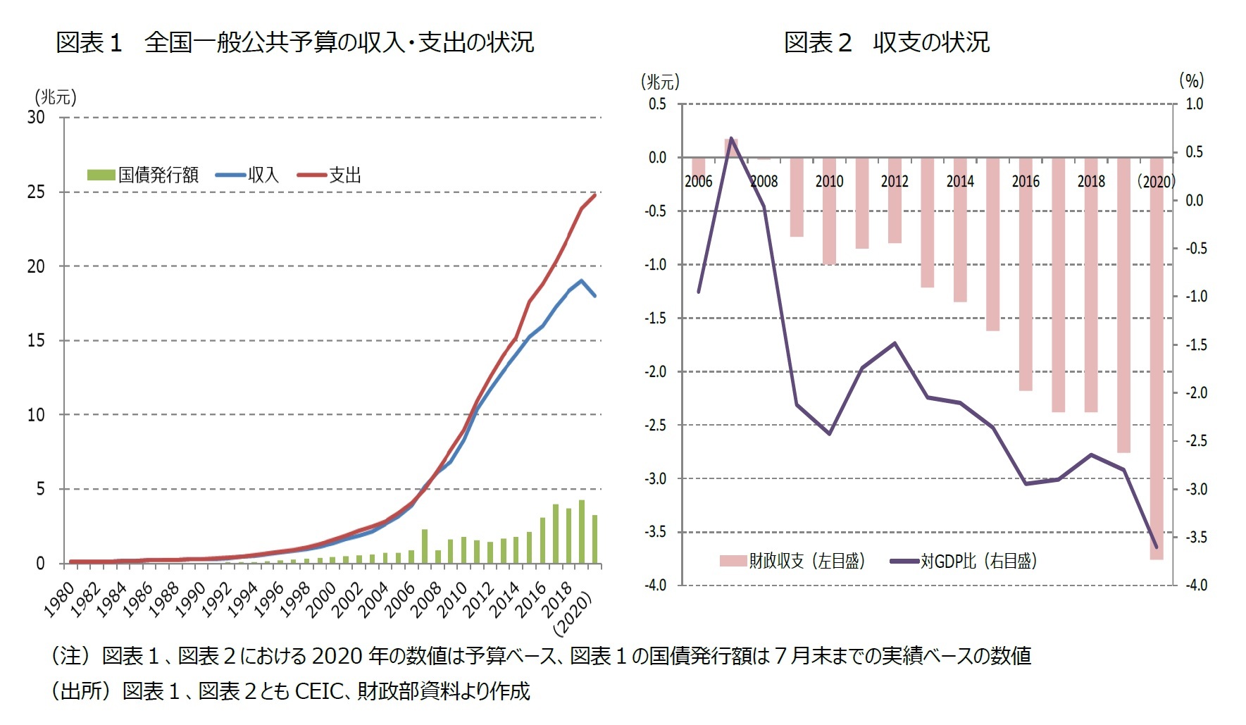 新型コロナウイルスへの対応が続く中、各国では様々な財政政策が実行されている。中国では、これまでの大規模減税・社会保険料負担の減免や地方を中心とした公共投資といった景気対策は維持しつつ、さらに新型コロナ対策として赤字枠の拡大や特別国債の発行など積極的な財政出動を行っている。2008年のリーマンショック後のインフラ投資を中心とした4兆元の財政出動と比較されることもあるが、今回は、公共衛生や感染症対策、更に、雇用、国民の生活、それを支える地方末端行政へのサポートなど、より暮らしを支える施策となっていると言えるであろう。