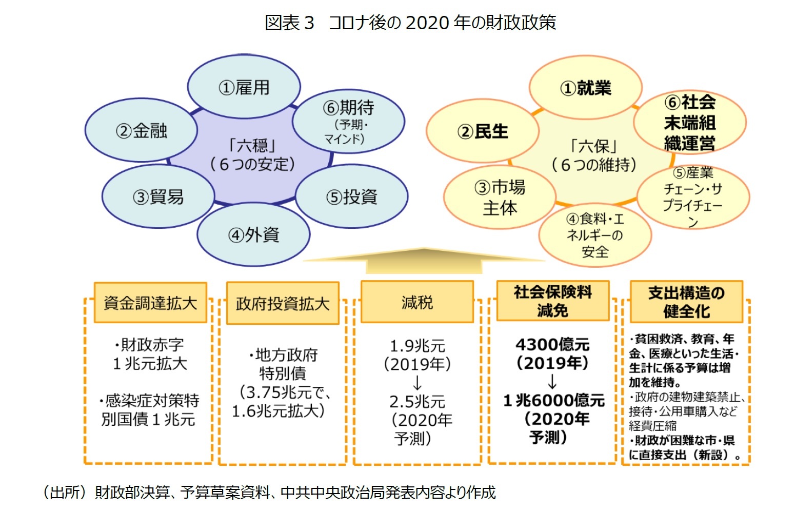 新型コロナを経て、5月の全人代で承認された2020年の財政予算には、これまでの‘6つの安定’(「六穏」)に加えて、‘6つの維持’(「六保」)を支えるための5つの財政政策が盛り込まれている(図表3)。