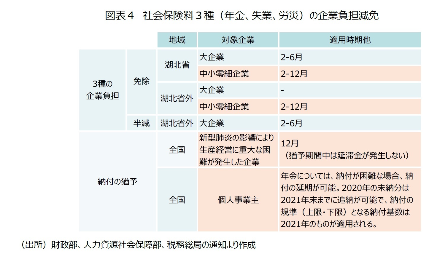 新型コロナ以降、実施されている‘6つの維持’(「六保」)であるが、その中でも重視されているのが、就業、民生、社会の末端組織運営の‘3つの維持’(「三保」)である。これは、社会保障とも大きく関係している。5つの財政政策の中でそれに該当するのが残りの(4)社会保険料の減免、(5)支出構造の健全化における特殊移転支出である。(4)保険料の減免については、年金、失業、労災保険の企業負担を減免し、雇用を維持した企業には失業保険料を返還するなど、企業活動のコスト軽減、雇用継続をサポートするものである。当初、米国との貿易摩擦から企業負担軽減のため、2019年の5月から実施されていたが、新型コロナを経て、その期間が延長されている(図表4)。3種類の社会保険料の減免分は2020年の通年で1.6兆元に達すると推算されており、これは2019年の同3種の社会保険料収入4.2兆元の38%に相当する。