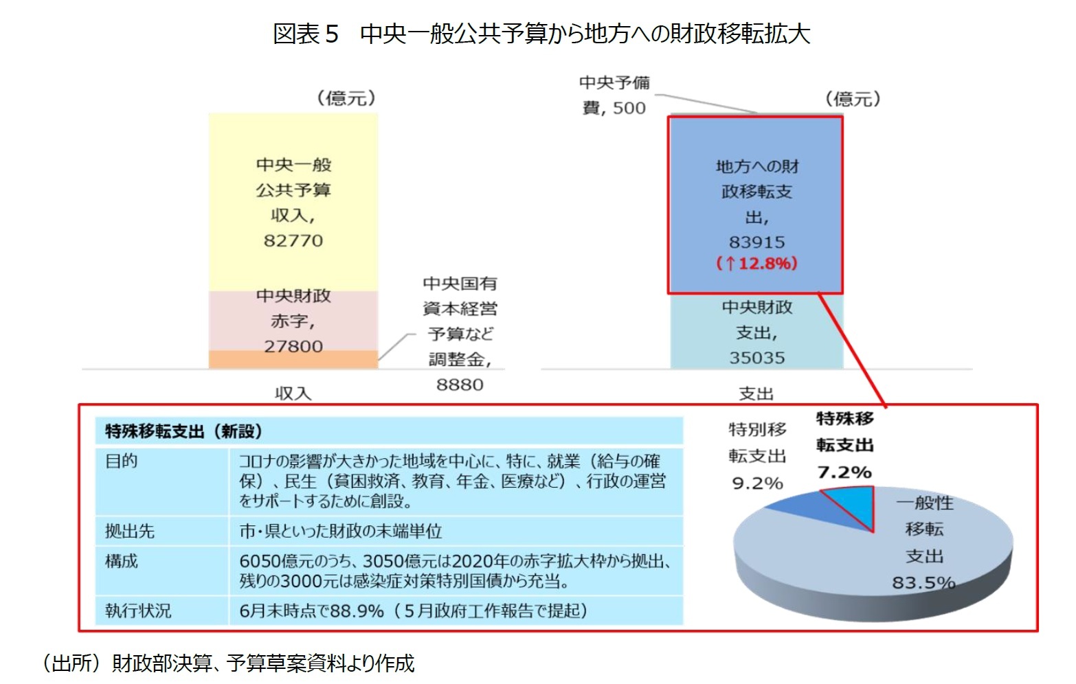 (5)支出構造の健全化とは、雇用、貧困救済、教育、年金、医療といった生活・生計に係る予算の増加を維持し、その一方で政府庁舎の新たな建設を禁止し、接待や公用車の購入などの経費を圧縮するというものである。特に、今般は「特殊移転支出」を新設し、中央財政から、市・県といった末端の行政単位に直接予算を振り分けている。新型コロナ以降、雇用や貧困救済など行政や社会サービスを直接担い、更にコロナの影響が大きかった市や県に速やかな資金的援助を行えるよう取り計らっている。2020年の予算では、中央から地方全体への財政移転は、前年比12.8%増の8兆3915億元と大幅に増加している(図表5)。そのうち、特殊移転支出は7.2%を占める6050億元となっており、この財源として、3050億元は1兆元の赤字拡大枠から拠出され、残りの3000億元は感染症対策特別国債から充当されている。特殊移転支出は5月の政府工作報告で提起されたが、6月末時点ではすでに88.9%が執行されている。