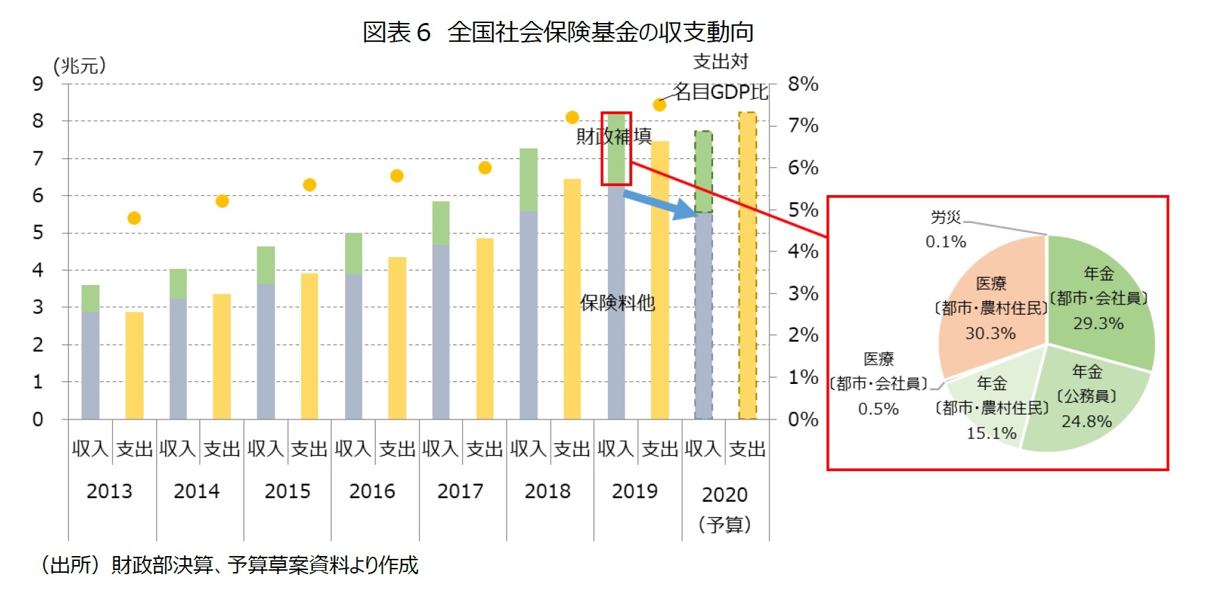中国では、一般公共予算(一般会計)とは別に、社会保険を運営する上で、収入、支出などの財源を管理する社会保険基金がある。2020年(予算)の社会保険料収入は、社会保険料の企業負担の減免、新型コロナによる経済への影響から前年比7%減の5.2兆元とされている。財政補填は前年比12%増の2.2兆元と最大規模となり、収入全体の28%を占めるまで拡大する(図表6)。これに対して、支出は前年比10%増の8.2兆元まで膨らみ、予算段階では収支は赤字となる。社会保険基金は2014年以降、保険料等のみでは支出が賄えなくなっており、財政補填への依存度が年々高まっている。