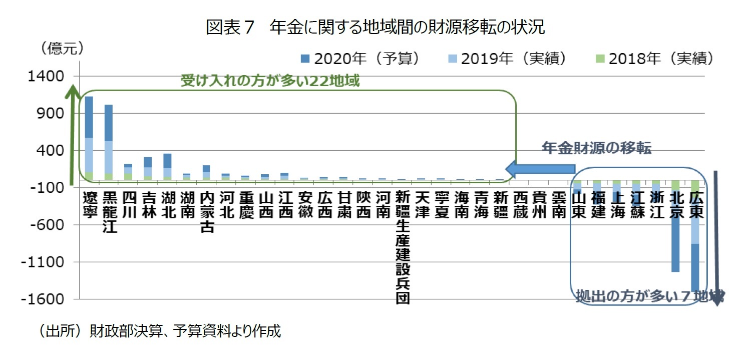 これらの年金保険料の減免分をどう補填していくのか。現時点で発表されているのは主に2つある。1つは中央財政による年金特別補助金5800億元の拠出である。2つ目は、中央や地方財政による拠出ではなく、各省で管理されている年金積立金を地域間で財源移転するものである。中央調整基金を使って、定年退職者数の多い地域により多く財源を分配するもので、これによって2020年は合計7400億元が調整される予定だ。このような財源移転は2018年から実施されているが、財源移転の規模は毎年増加している。加えて、広東省など7つの省・直轄市が22の省など地域を支えている状態にある(図表7)。2019年時点で年金積立金は、5兆4623億元と余裕はある。しかし、中国社会科学院は、企業の年金保険料の負担割合を現行(16%)のままとした場合、年金積立金は2027年の7兆元をピークに減少に転じ、2035年には枯渇する予測を発表している。このような状況においても、中央政府は2020年の年金支給を前年より5%増額するよう求めており、制度を運営する地方財政へのプレッシャーの増大も懸念される。