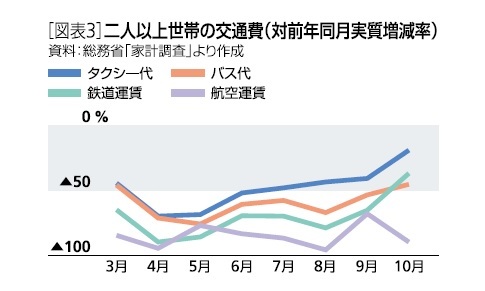 一方、自動車や自転車などのセルフ手段の購入は3月以降、前年より増えた月の方が多い(図表略)。また、先のニッセイ基礎研究所の調査によると、コロナ禍で公共交通機関の利用は減少する一方、セルフ手段の利用は増えており、公共交通機関の利用控えの一部がセルフ手段の利用へとシフトしているようだ。