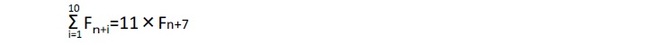 (その3)フィボナッチ数の累和や累積等については、多くの関係式が成立している。そのうちのいくつかの例を挙げると、例えば以下の式が成り立つ。