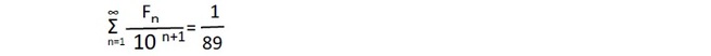 ここで、F11=89 である。上記の関係式は、この1/F11 は、全てのフィボナッチ数を小数点以下一桁ずつずらして得られる数値の総和として表現されるということである。具体的には以下の通りである。