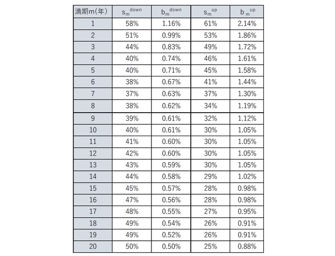 5.9 20~90年の満期の場合、𝑠𝑚𝑑𝑜𝑤𝑛の値は線形補間される。90年以上の満期の場合、𝑠𝑚𝑑𝑜𝑤𝑛の値は20%になる。20~60年の満期の場合、𝑏𝑚𝑑𝑜𝑤𝑛の値は線形補間される。60年以上の満期の場合、𝑏𝑚𝑑𝑜𝑤𝑛の値は0%になる。