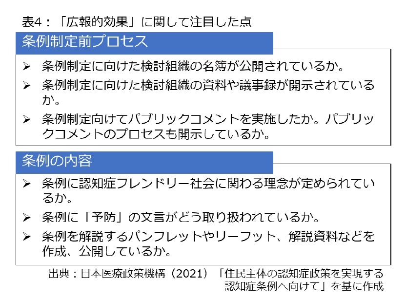今後、認知症条例を制定しようとする自治体は条例の制定プロセスの透明化とともに、認知症の人の尊厳や「予防」の文言には十分、留意することが求められる。