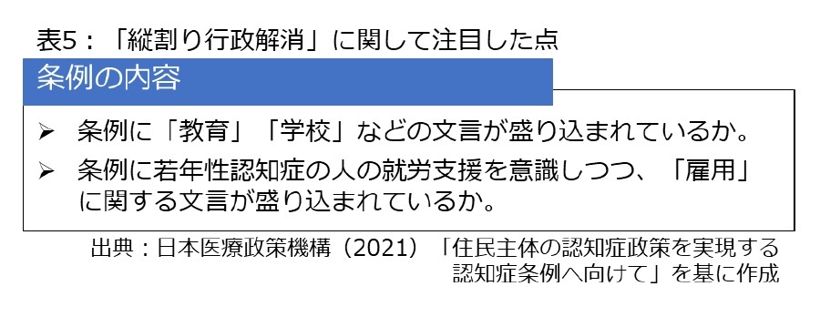 縦割り行政の観点で言うと、学校や教育との関係については、ほとんど全ての自治体で意識されていたが、今後の取り組みが欠かせない。実際、政府の認知症大綱でも学校における認知症サポーター養成講座の受講促進が明記されており、先に触れた民間企業との関係性強化とともに、これから認知症条例を定める自治体、あるいは既に定めた自治体にとって大きな課題と言える。
