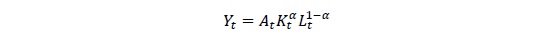 ここで、Yt:潜在GDP、At:全要素生産性(技術力)、Kt:資本投入量、Lt:労働投入量、α:資本分配率である。潜在的な生産力は資本投入量と労働投入量と技術力の向上で説明できることを意味している。潜在GDPは労働や資本などの生産要素を最大限に稼働させて得られる生産力(実質GDP)の上限と定義される。この関係から、キャッシュレス化が進展することで、技術革新を促進する、または、生産に投入される資本量や労働量が増えれば、長期的に実質GDPが上昇するものと期待できる。