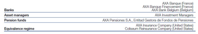 2020年12月31日現在で、AXAのグループSCRは275億ユーロで、内部モデル範囲(246億ユーロ)、標準式会社(10億ユーロ)、同等性による会社(0億ユーロ)、部門別ルール (年金事業、銀行、資産運用)(19億ユーロ)という異なる要素に分割される。AXAグループSCRに関する追加情報については、QRT S.25.02.22「ソルベンシー資本要件- 標準式及び部分内部モデルを使用するグループのための」を参照のこと。