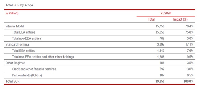 SCRについては、監督当局の承認を受けた会社の金融リスク、信用リスク、生命保険引受リスク、損害保険引受リスクとオペレーショナルリスクをカバーする内部モデルとその他の(再)保険会社に対する標準式及び他の規制セクター(銀行業や年金業務)に対するセクターの要件を適用して算出される。なお、オペレーショナルリスクについては、2019年においてはグループの全ての保険会社において標準式により計測されていたが、2020年は内部モデルを適用している。