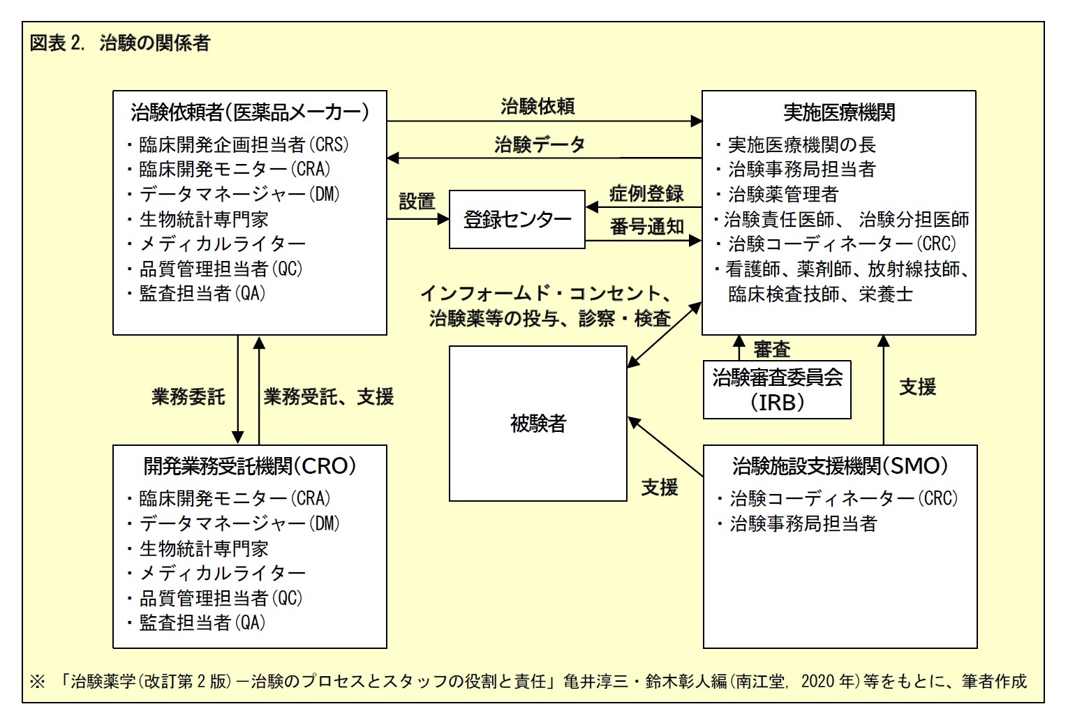 治験を円滑に進めるためには、治験依頼者である医薬品メーカー、治験を行う実施医療機関、治験に参加する被験者の協力が欠かせない。近年、治験の内容が複雑化していることもあり、これらをサポートしたり、治験業務の一部を受託したりする機関の役割も重要となっている。このうち、開発業務受託機関(Contract Research Organization, CRO)は、治験依頼者を支援する。一方、治験施設支援機関(Site Management Organization, SMO)は、実施医療機関や被験者をサポートする。