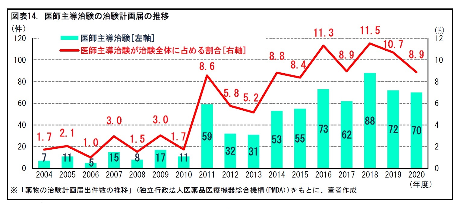 医師主導治験は、2010年代に入って増加傾向となっている。とはいえ、現在の治験の多くは、企業治験である。2020年度の医師主導治験の届出数は、治験全体の1割程度にとどまっている。一般に、小児疾患や希少疾患の場合、患者数が限られるため、医薬品メーカーにとって採算が合わず、治験が困難となる場合がある。こうした疾患では、医師主導治験への期待が大きい。