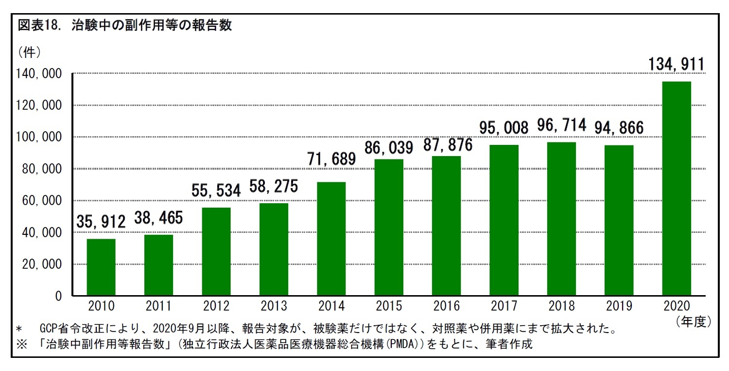 治験中の副作用等の報告の推移をみてみよう。報告数は、近年、増加傾向にある。GCP省令の改正により、2020年9月以降、副作用報告の対象が、被験薬だけではなく、対照薬や併用薬にまで拡大された21こともあり、2020年度には134,911件にまで増加している。