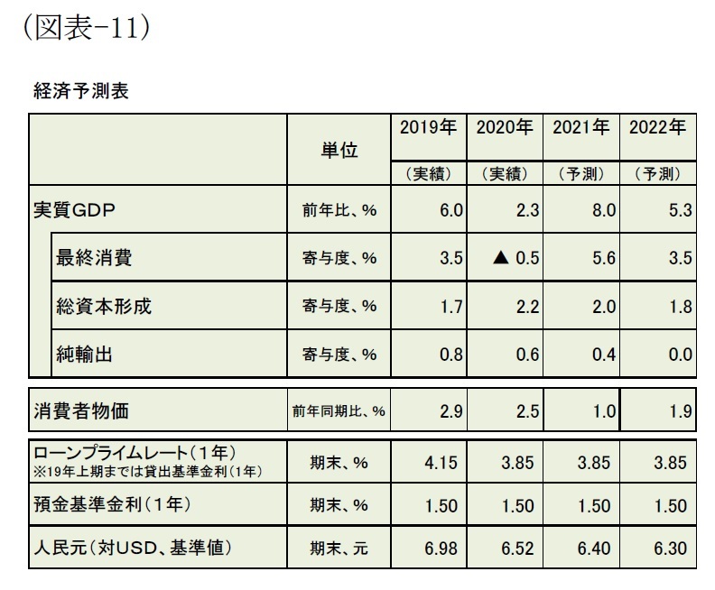 2021年の経済成長率は実質で前年比8.0%増、2022年は同5.3%増と予想している(図表-11)。現在の経済政策は、新型コロナ対策で拡大した財政赤字を縮小し、新型コロナ対策で緩んだ金融規律を引き締める段階にあるため、経済成長率は巡行速度(=大規模な政策支援なしで無理なく成長できる水準、筆者は5%前後と推定)に回帰していくことになるだろう。需要項目別に見ると、消費に関しては所得環境、雇用環境、消費者心理の改善に加えて中国政府の内需拡大策にも期待できるため、21年が5.6ポイント、22年が3.5ポイントの高いプラス寄与を予想している。投資に関しては財政出動を受けたインフラ投資や金融緩和を受けた不動産開発投資が減速する一方、新型インフラ建設や個人消費拡大に関連した投資が増えると見込み、2%ポイント前後のプラス寄与を予想している。また、輸出に関しては、世界的にワクチン接種が進むとともに追い風が止まると見込み、22年にはプラス寄与がゼロになると予想している。