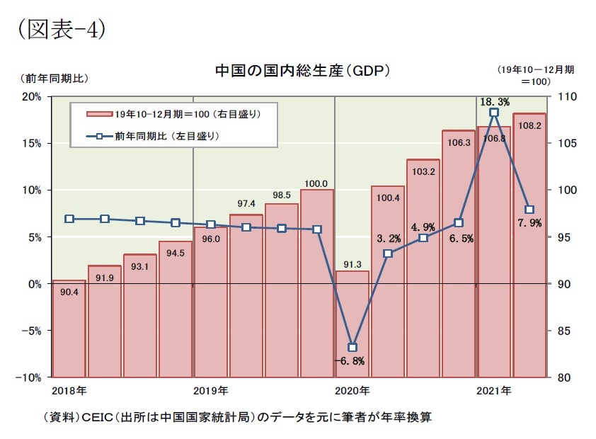 コロナ前(19年10-12月)の実質GDPを100とした指数を見ると(図表-4)、コロナ禍で混乱した20年1-3月期には91.3と中国経済は急収縮を余儀なくされた。しかし、財政金融両面からの新型コロナ対策を実施したことや厳格な防疫管理でコロナ禍を早期に収束させたことが奏功し、4-6月期には100.4と早くもコロナ前の水準を上回った。その後も散発的な感染拡大はあったものの小振りで早期に収まったため、7-9月期には103.2、10-12月期には106.3、21年1-3月期には106.8、4-6月期には108.2と右肩上がりで回復していくこととなった。