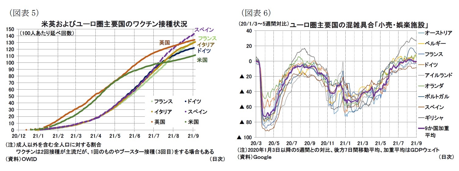 また、フランスやイタリアをはじめとした一部の国で、対面サービス産業を利用する際の条件としてワクチン接種証明の提示を導入する動きも見られる。これは感染拡大リスクの抑制と経済活動の維持を両立する手段と考えられ、感染者数が増加する局面でも医療崩壊リスクを抑制しサービス消費を回復させるのに寄与すると考えられる。