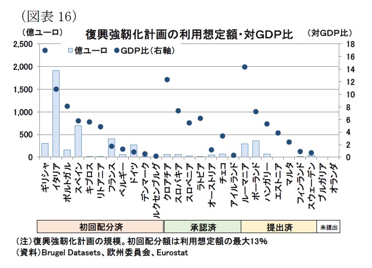 財政面では、昨年設立が合意された7500億ユーロ(2018年価格、うち補助金3900億、融資3600億)規模の復興基金(「次世代EU」)の稼働が円滑に進んでいる。基金の中核となる「復興・強靭化ファシリティ(6725億ユーロ)」に関して、執筆時点(9月9日)時点ではEU27か国のうち25か国が基金の使途をまとめた「復興・強靭化計画」を提出しており、うち11か国は欧州委員会の審査と欧州理事会の承認を経て初回の資金配分がされている(図表16)。