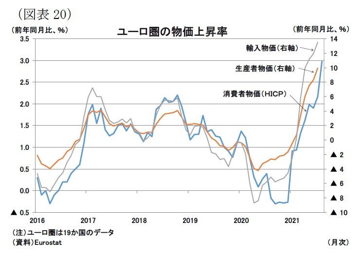 一方、企業活動としては上記で見たように部品・原材料不足による供給制約による影響が懸念される(図表18)。供給制約の解消は少なくとも年内は難しいと見られ、製造業に関しては域内・域外の需要が増加する局面でも、ドイツを中心に生産の伸びが限定される状況が当面は続くだろう7。