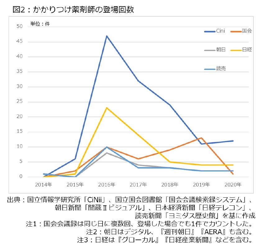 1|突然浮上したことを示す数字実は、政策形成過程で「かかりつけ薬剤師」「かかりつけ薬局」という言葉が一般的に使われるようになったのは最近に過ぎない。図2は国立情報学研究所が提供する「CiNi」(NII学術情報ナビゲータ)、国立国会図書館が運営する「国会会議検索録システム」、さらに『朝日新聞』、『日本経済新聞』、『読売新聞』のデータベースで、「かかりつけ薬剤師」という言葉がヒットした回数の年次別推移である。