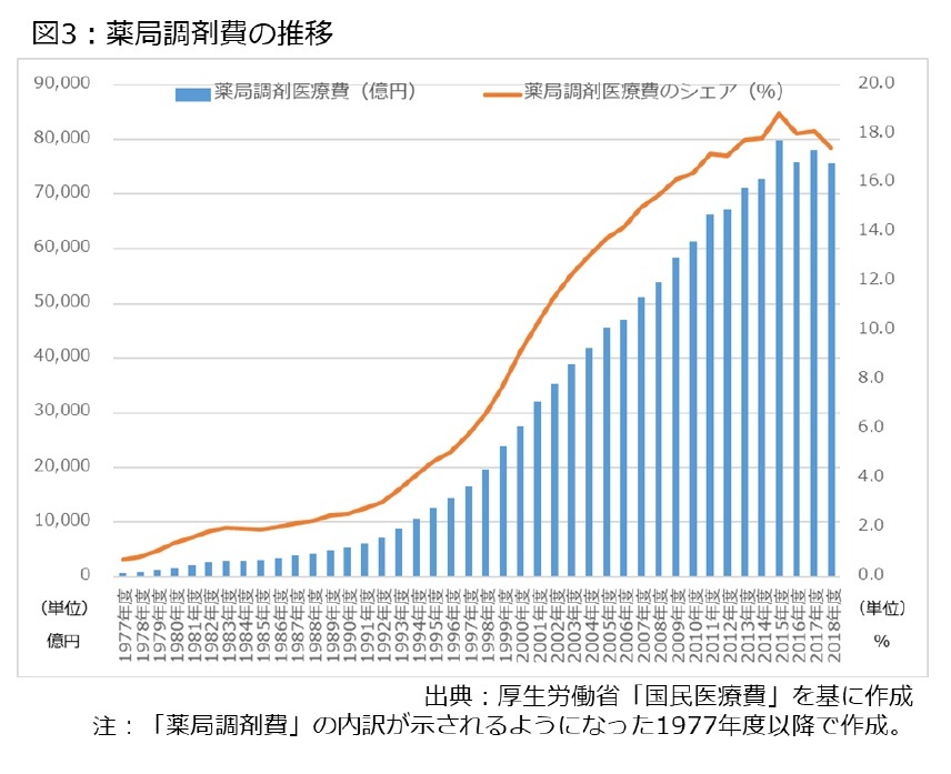 なお、2015年度を境にして、薬局調剤医療費の金額と、国民医療費に占めるシェアが低下している点については、特殊要因と制度的な要因が考えられる。2016年度については、C型肝炎治療薬が登場したことに伴って2015年度の医療費が大きく伸びた反動に伴う減少と考えられる。