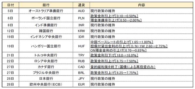 新興国ではロシア、ブラジル、ハンガリー、ポーランドで政策金利が引き上げられた。ブラジルとロシアは6会合連続の利上げ、ハンガリーは5会合連続の利上げとなり、いずれも高インフレ率が継続していることから、引き続き金融引き締めを強めている。また、ポーランドは12年5月以来となる利上げを実施、これまでのハト派姿勢から引き締め姿勢に転じている。