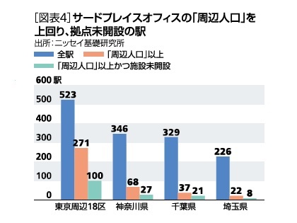 首都圏「郊外」の全1,424駅について、「周辺人口」(半径1キロ圏内)が、サードプレイスオフィスの「周辺人口」(平均値)を上回った駅は、約3割の398駅( 東京都271駅・神奈川県68駅・千葉県37駅・埼玉県22駅)、このうち、駅1キロ圏内に拠点が未開設の駅は、156駅(東京都100駅・神奈川県27駅・千葉県21駅・埼玉県8駅)であった(図表4)。