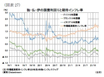新型コロナウイルスでは、感染力が高い変異株や重症化しやすい変異株が流行すれば医療崩壊リスクが高まる。供給制約や高インフレが長期化・悪化することも下方リスク要因である。供給制約や高インフレは、コロナ禍を契機にした財消費の増加(巣ごもり需要)から生じている面があるため、コロナ禍の長期化が供給制約や高インフレといった悪影響も助長する可能性もある。加えて、インフレ率については、ECBが警戒するような賃金インフレが発生し、コロナ禍の一過性要因ではなく、物価と賃金が相互に上昇する持続的なインフレとなる可能性がこれまでより高まっている。ECBの目標を上回る賃金・物価の上昇が続く場合は、ECBに金融引き締めが求められ、金利も上昇すると見込まれることから、投資等の下押し圧力になるだろう。