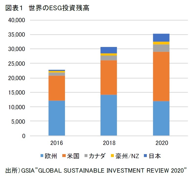 サステナブル投資フォーラムの世界的な組織であるGSIA(Global Sustainable Investment Alliance)が隔年で作成している報告書(2020版)によれば、2020年の世界のESG投資残高は約35兆ドルに達している。これは2016年の1.5倍の水準であり、ESG投資への関心が急速に高まっていることが窺える(図表1)。日本でも2015年にGPIF(年金積立金管理運用独立行政法人)がPRIに署名したことを契機にESG投資への関心が高まっており、日本におけるESG投資の残高は2016年の約0.5兆ドル(約56兆円)から2020年には約2.9兆ドル(約310兆円)へと6倍に増加。欧米に比べESG投資の立ち上がりが遅れた分、ここ数年の増加ペースは欧米を大きく上回っている。