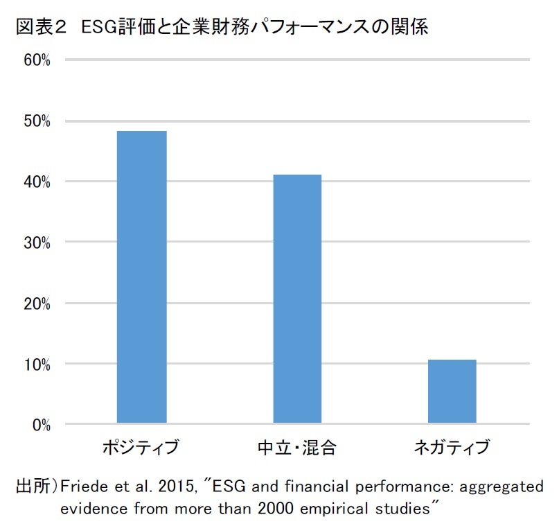 ESG評価の有効性を検証する研究は多数あるが、ESG評価と企業財務パフォーマンス(企業財務、投資パフォーマンス、成長指標、リスク指標など)の関係性を分析する実証研究を幅広くサーベイした論文によれば、両者の間にポジティブな関係があると結論付ける研究、つまり、ESG評価が投資に有効とする結論は全体の48.2%を占め、ネガティブの10.7%を大きく上回っている。しかし、中立・混合を含む、ポジティブ以外の研究結果が過半数を占める。ESG投資は決して否定されるものではないが、“ESG投資は有効”と明確に言えるような結果でもない。その要因として、分析に利用するデータや分析方法が異なる多様な分析が混在していることのほか、サーベイの対象となった研究が実施された時期が影響している可能性が考えられる。サーベイの対象となった研究は、サーベイ論文が公表された2015年以前のものである。ESGを投資に活かす機運は現時点ほどには高まっていなかったと推測される。少なくともESGを含む非財務の情報開示が総じて限られ、ESGを適切に評価できる環境が整っていなかったことを勘案すると、ESG投資の有効性が明確にならなかったことに違和感はない。