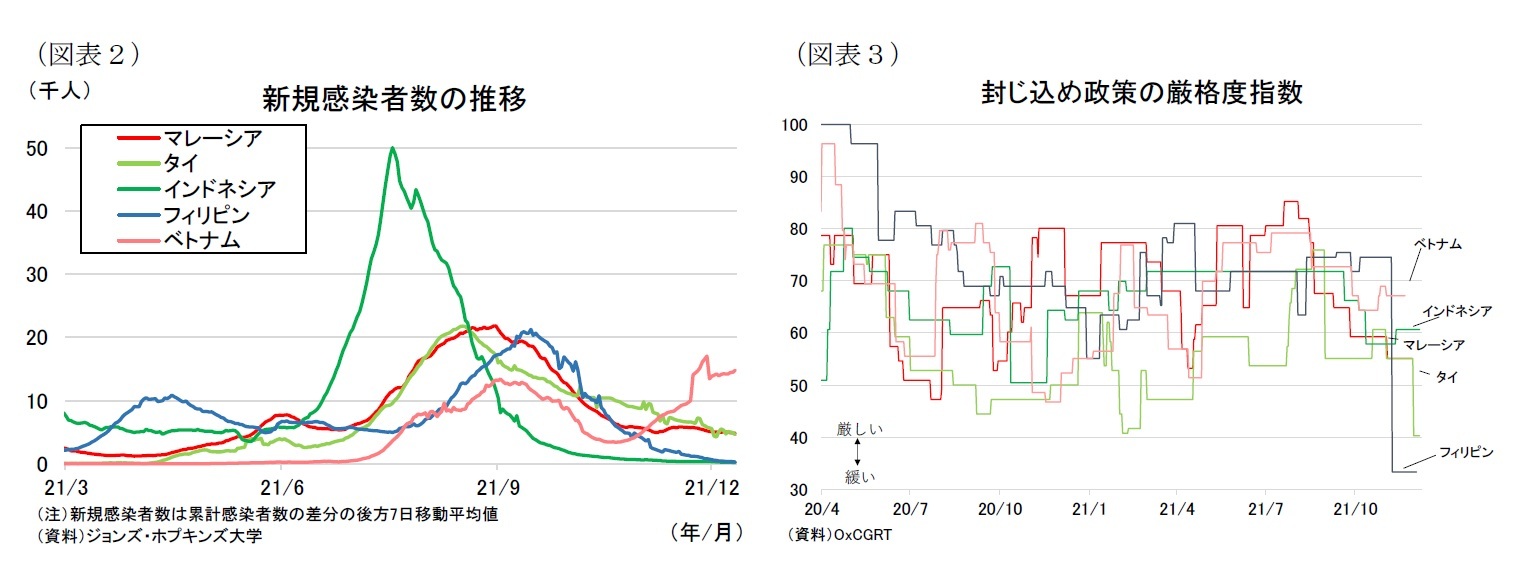 東南アジア地域の新型コロナ感染動向は総じて改善の動きがみられる(図表2)。今年に入って各国で感染再拡大の動きが始まり、6月以降はインドネシアをはじめとして、タイやマレーシア、フィリピン、ベトナムで感染ペースが次々に加速、インドネシアとフィリピン、マレーシアでは医療体制が逼迫する事態となった。しかし、各国の厳しい活動制限措置が1~2ヵ月実施されたことにより、インドネシアでは7月、タイでは8月、マレーシアとフィリピン、ベトナムは9月に新型コロナ感染がピークアウトし、感染状況が改善に向かっている。