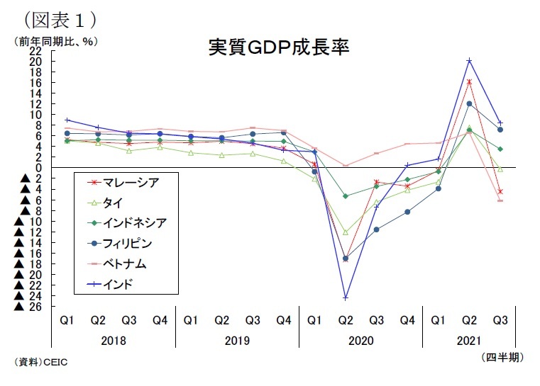東南アジア5カ国の経済は昨年、新型コロナウイルス感染拡大と各国の活動制限措置の影響が直撃した4-6月期に急速に悪化し、ベトナムを除く4カ国(マレーシア、タイ、インドネシア、フィリピン)がマイナス成長に落ち込んだ(図表1)。その後、各国の制限措置が続いたことから21年1-3月期まで経済の停滞が目立った。21年4-6月期は東南アジア地域でデルタ株が蔓延して感染再拡大が生じたため、各国政府は厳しい活動制限措置の実施を迫られ、実体経済が停滞した国が多かったが、成長率(前年同期比)は昨年の実質GDPが大幅に減少した反動(ベース効果)により大きく上昇した。しかし、7-9月期は更なる感染拡大により都市封鎖など活動制限が厳格化される傾向が強まり、成長率が大きく低下することとなった。