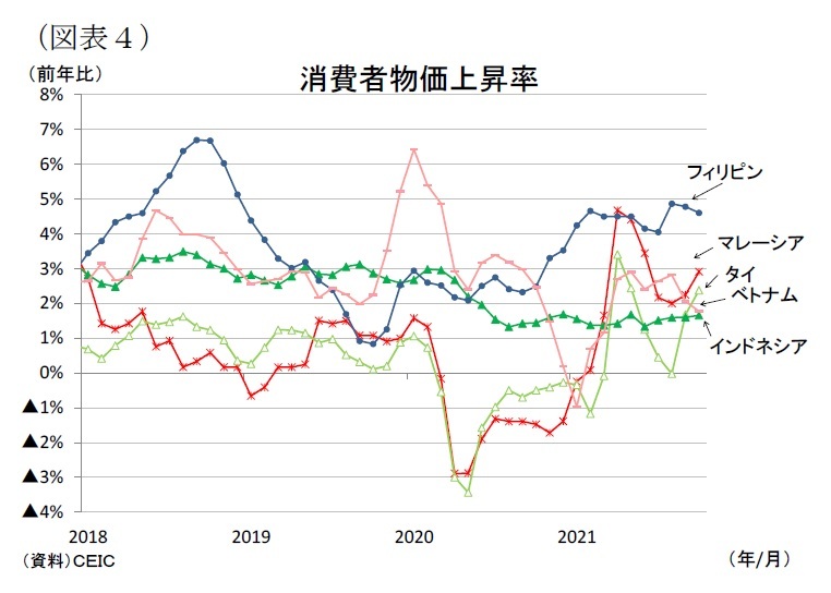 7-9月期の実質GDP成長率(前年同期比)は、フィリピン(同+7.1%)とインドネシア(同+3.5%)が昨年の実質GDPの落ち込みが大きかったためにプラス成長となったが、マレーシア(同▲4.5%)とタイ(同▲0.3%)、ベトナム(同▲6.2%)は活動制限による経済停滞によりマイナス成長に転落した。