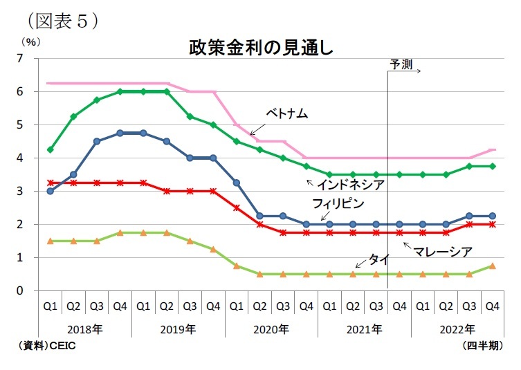 東南アジア5カ国の金融政策は昨年、新型コロナの世界的な感染拡大の影響が直撃すると、各国中銀が段階的な利下げを実施、その後も緩和的な金融政策が維持されている(図表5)。