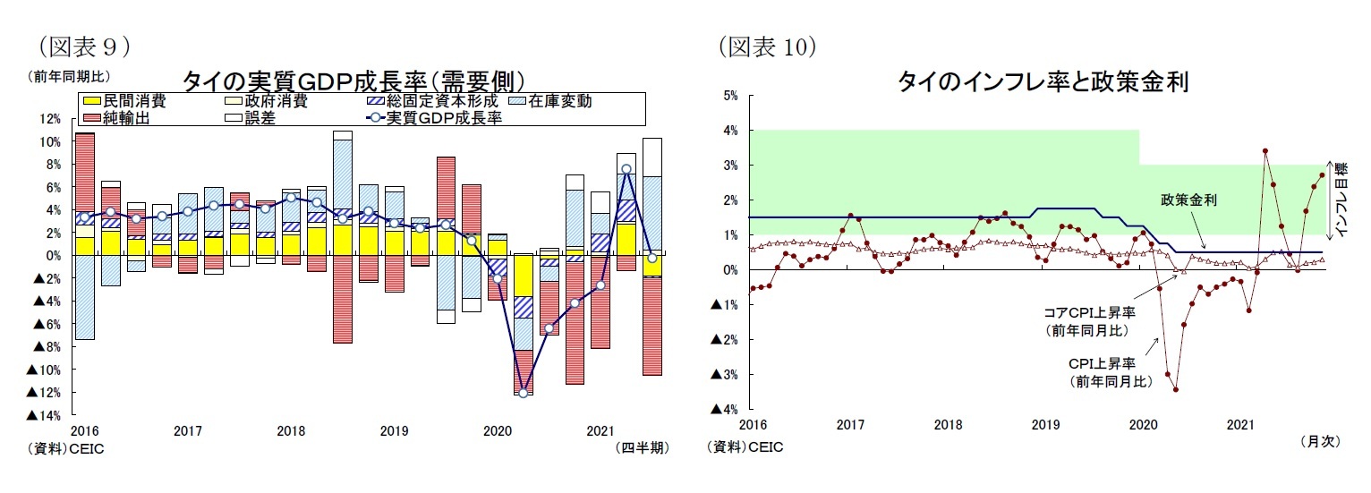 タイ経済は昨年、新型コロナウイルスの感染拡大を背景に急速に景気が悪化、タイ政府が実施した外出・移動制限措置により経済活動が停滞して2020年の実質GDP成長率が前年比▲6.1%と減少した(図表9)。タイ政府は早期のウイルス封じ込めに成功して行動制限を段階的に緩めたが、本格的な経済再開には至らずマイナス成長が続いた。今年4-6月期は前年同期の落ち込みからの反動増により前年同期比+7.6%のプラス成長に転じたが、7-9月期の成長率は同▲0.3%と再び減少した。