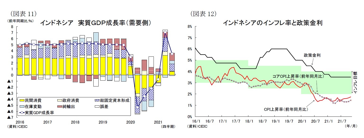 インドネシアは昨年、新型コロナウイルスの世界的な感染拡大を背景に経済活動が停滞して、2020年の成長率が前年比▲2.07%と減少した(図表11)。感染第1波の長期化によりインドネシア政府が各種行動制限を継続したため、経済活動の再開が遅れてマイナス成長が続いたが、今年4-6月期の実質GDPは実体経済の持ち直しと前年同期の落ち込みからの反動増(ベース効果)により+7%成長(前年同期比)に急上昇し、7-9月期の実質GDPは同+3.51%となり回復ペースが鈍化した。