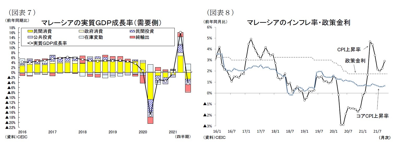 マレーシア経済は昨年、新型コロナウイルスの感染拡大を背景に経済が停滞した。国内外で実施された活動制限措置の影響が本格的に現れて2020年の実質GDP成長率が▲5.6%と急減した(図表7)。マレーシアは比較的早期にウイルスの封じ込めに成功して活動制限措置を段階的に緩和したが、経済活動の回復が遅れてマイナス成長を続けた。今年4-6月期の成長率はベース効果により前年同期比+16.1%に急上昇したが、7-9月期は同▲4.5%と再び減少することとなった。