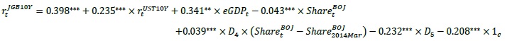 第6項と第7項は、日本銀行による国債買入が日本国債金利(10年物)に与える影響を見ることを目的としている。日本銀行の全体に占める国債保有割合(