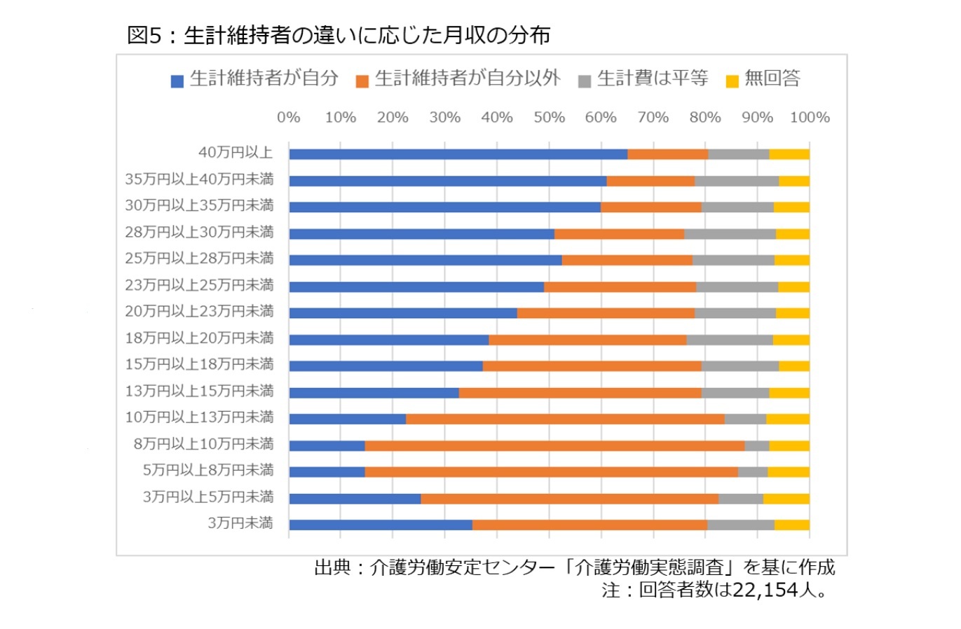 さらに、こうした職員に関しては、税制の配偶者控除の範囲内で給与を調整したり、社会保険の被扶養者の範囲内に収まるように時間・給与を調整したりしつつ、勤務しているケースが多いと見られる。実際、介護労働実態調査2020年度版を通じて、生計維持者が自分かどうかというカテゴリー分けで月収の分布を見ると、図5の通り、月収が低いゾーンでは「生計維持者が自分(本人)以外」の比率が高い。具体的には、「3万円以上5万円未満」から「15万円以上18万円未満」の範囲では、「生計維持者が自分(本人)」と答えた職員よりも、「生計維持者が自分(本人)以外」と答えた職員の方が多い。
