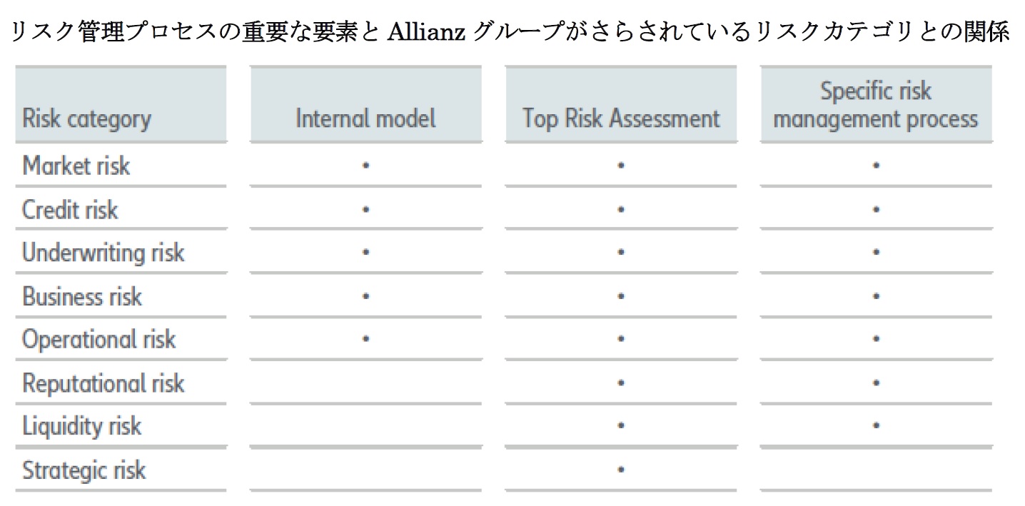 Allianzは、内部モデルと経営でのリスク管理プロセス等との関係について、「Allianzの配当政策の中心的要素は、内部モデルに基づくソルベンシーIIの資本化と関連している。これにより、我々はソルベンシーIIの枠組みに基づくリスクステアリングや資本化に関する整合的な考え方が可能になる。」として、「内部モデルはAllianzのビジネスステアリングに完全に統合されており、その適用はソルベンシーIIの下でのいわゆる『使用テスト(Use Test)』を満たしている。」と述べている。