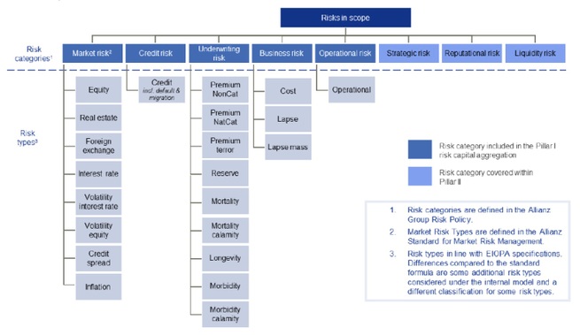 Allianzの内部モデルでは、市場、信用、生命保険引受、損害保険の保険料及び準備金、ビジネス、オペレーショナルの6つのリスクカテゴリに分類している。