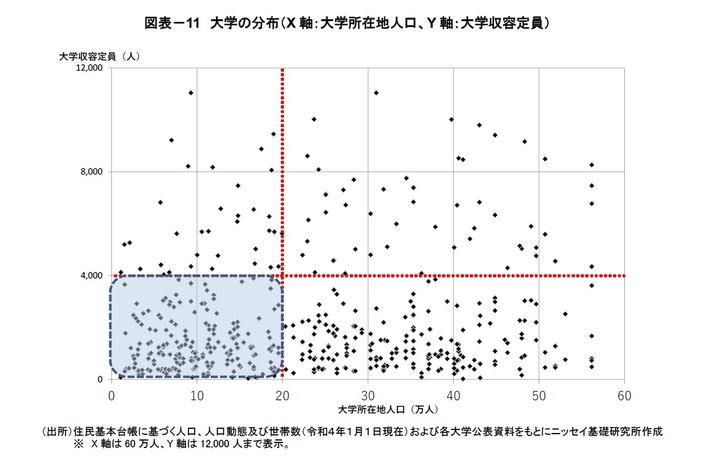 立地(大学所在地人口)と規模(大学収容定員13)に着目し、大学経営(私立大学)を分析した先行研究14によれば、大学所在地人口が20万人未満でかつ、大学収容定員が4,000人未満の場合、大学経営が悪化15する傾向にあると指摘されている。図表-11は、X軸に大学所在地人口(2022年時点)、Y軸に大学収容定員として、全国817校をプロットした散布図である。所在地人口が20万人未満でかつ、収容定員が4,000人未満である大学は196校(24%)が該当する。国立社会保障・人口問題研究所の人口予測16>に基づくと、2045年には216校(対2022年比+10%)へと増加することが見込まれる。