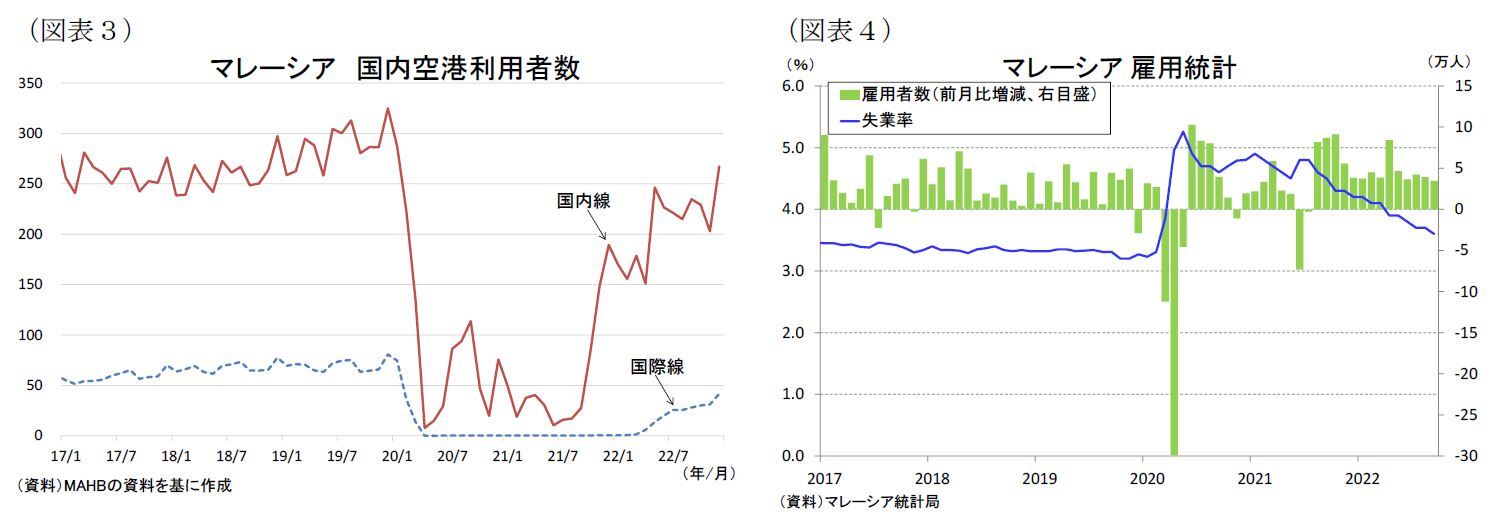 7-9月期はコロナ規制の緩和により経済活動の再開が進んだため内需が堅調に拡大、民間消費(同+7.4%)と民間投資(同+10.3%)がそれぞれ好調だった。マレーシアではオミクロン株の感染が落ち着き始めた昨年4月以降、隔離なしの入国を再開したほか、飲食店・小売店の営業時間規制や人員制限などを廃止、更には5月に屋外でのマスク着用義務を撤廃(9月には屋内も)した。規制緩和によりコロナ禍前の生活様式に戻っていくなか、10-12月の流通業売上高が同+14.3%と大幅な増加が続いた。(図表3)また12月の国内空港利用者数をみると、国内線がコロナ禍前の9割まで、国際線も6割まで持ち直してきている。こうして観光関連産業が回復する、失業率の低下(図表4)や賃金上昇など労働市場の改善が続いていることも消費の拡大に繋がっている。こうした中で事業環境の改善した企業の設備投資の回復も続いており、10-12月の完成工事高をみると民間部門が前年同期比23.5%と公共部門の同4.7%を大きく上回った。